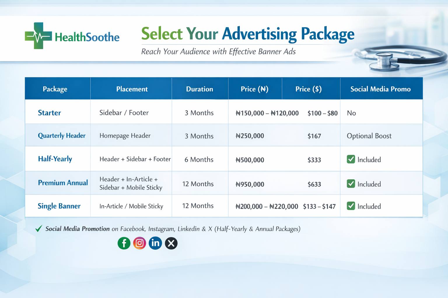 | Package | Placement | Duration | Price (₦) | Price ($) | Social Media Promo |